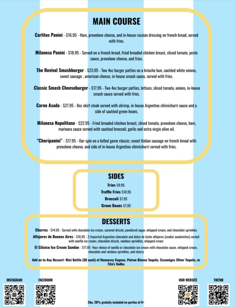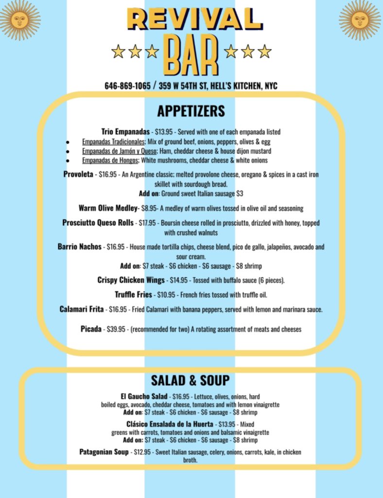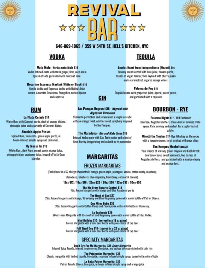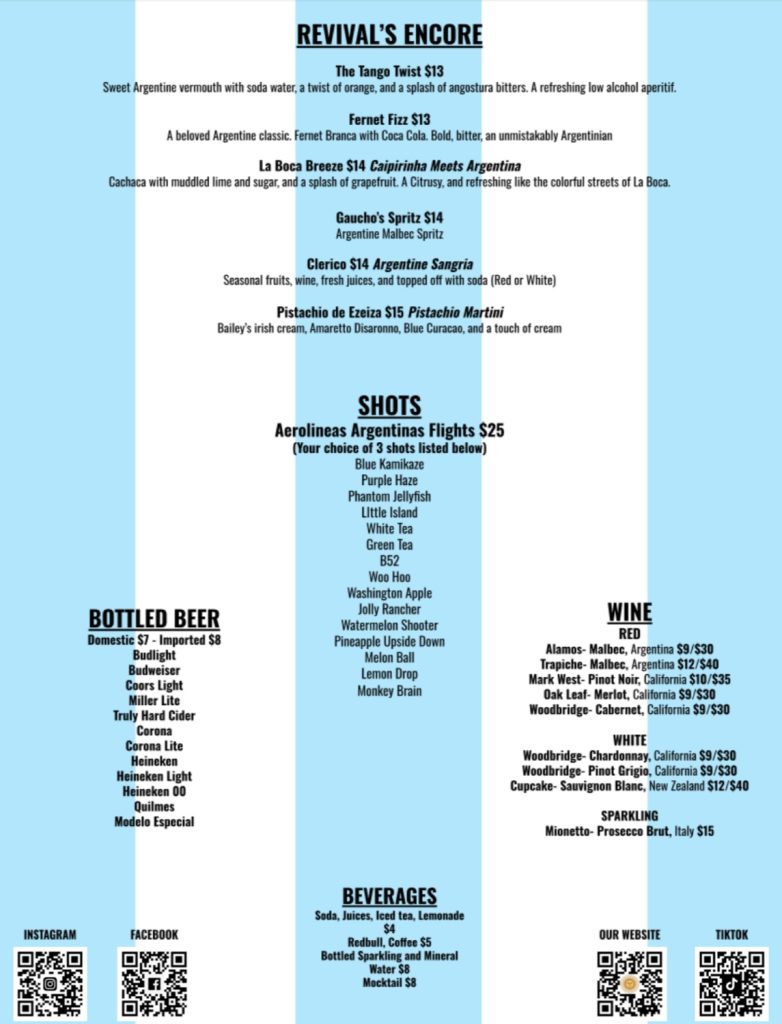 We strive to provide all the comforts and familiarity of a classic local bar with an invigorated dose of Argentine finesse. Equipped with TVs streaming all your soccer favorites, an ice-cold rotating draft selection, and a menu filled with all your Argentine and American classics, Revival has a little piece of familiarity for everyone.